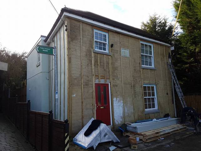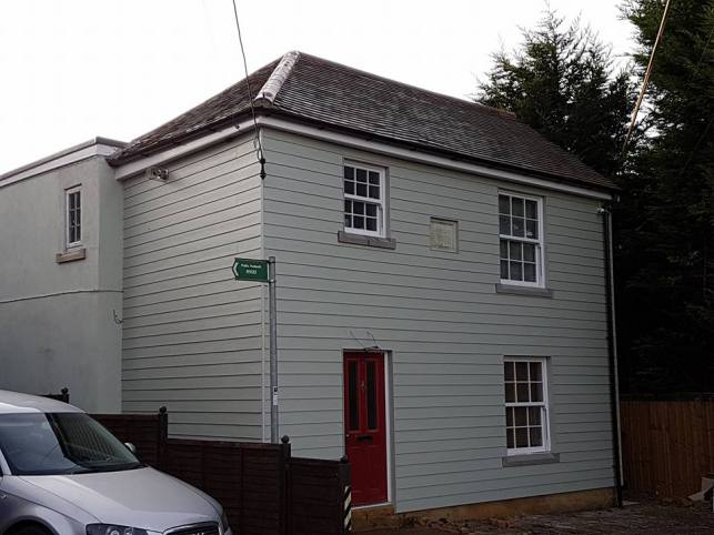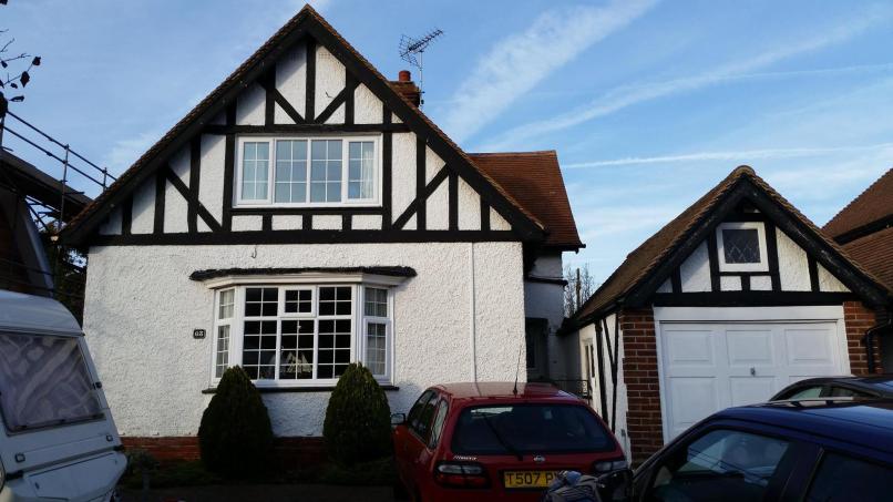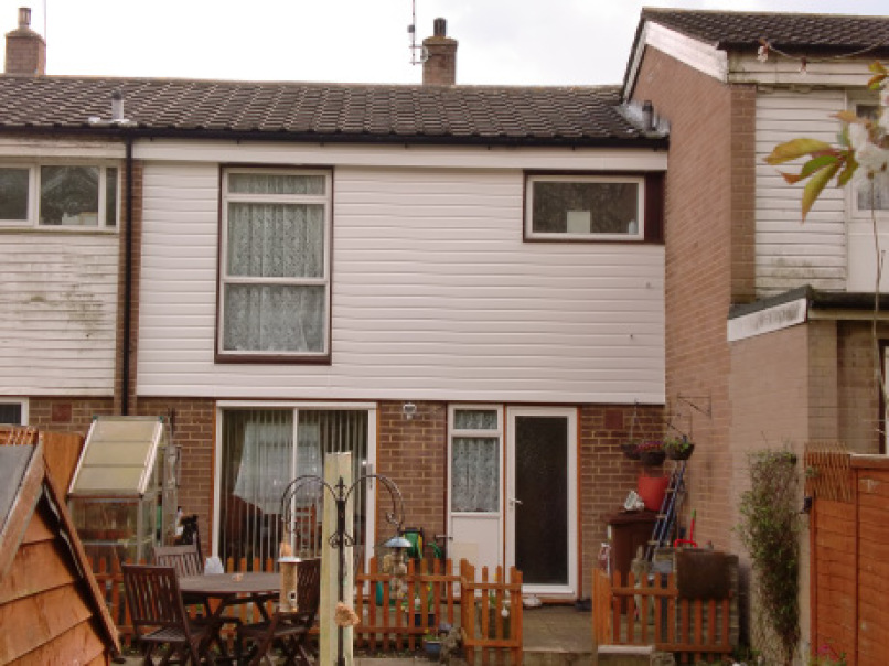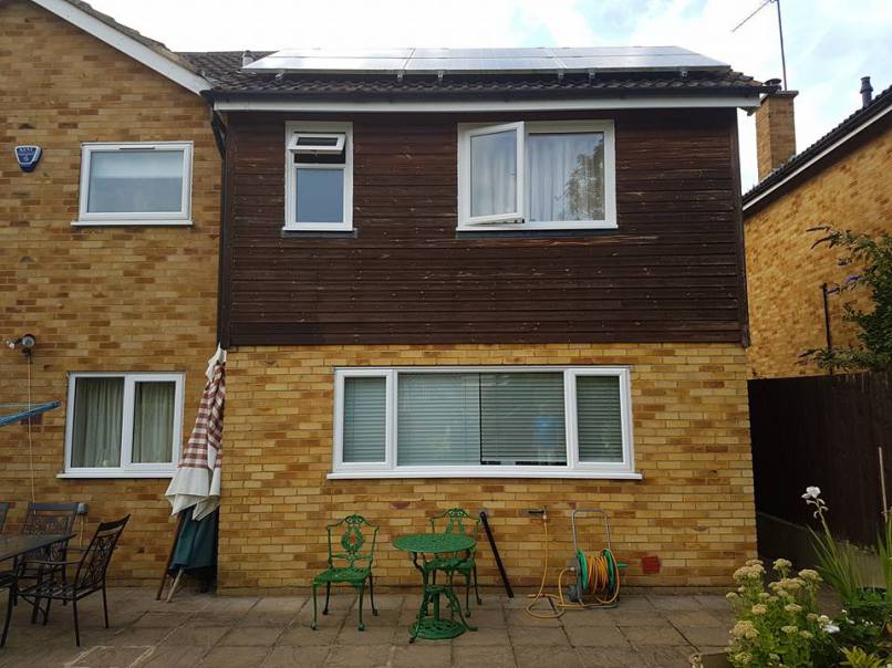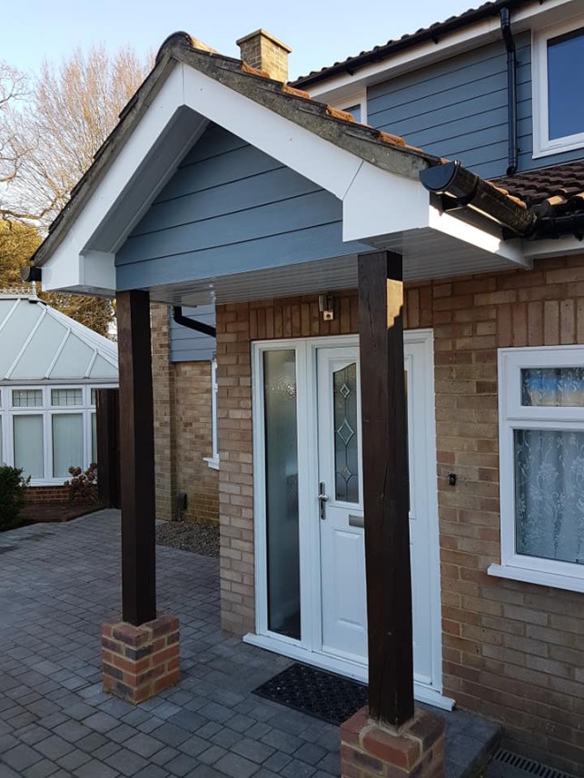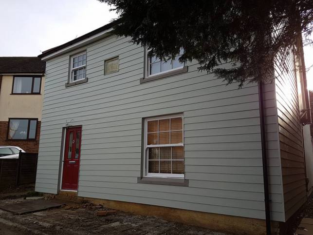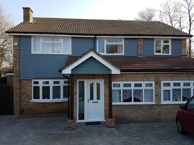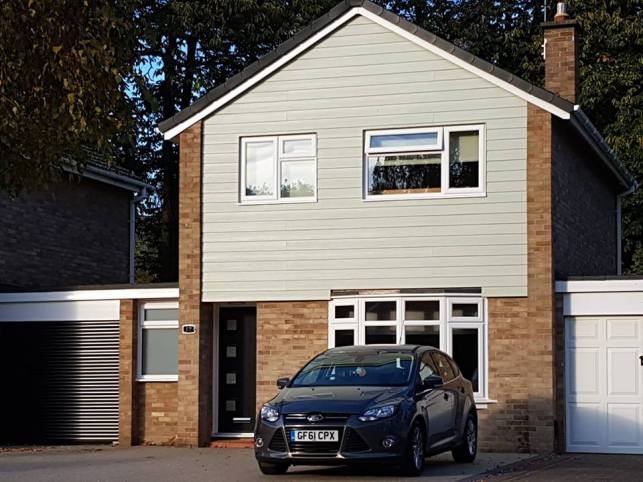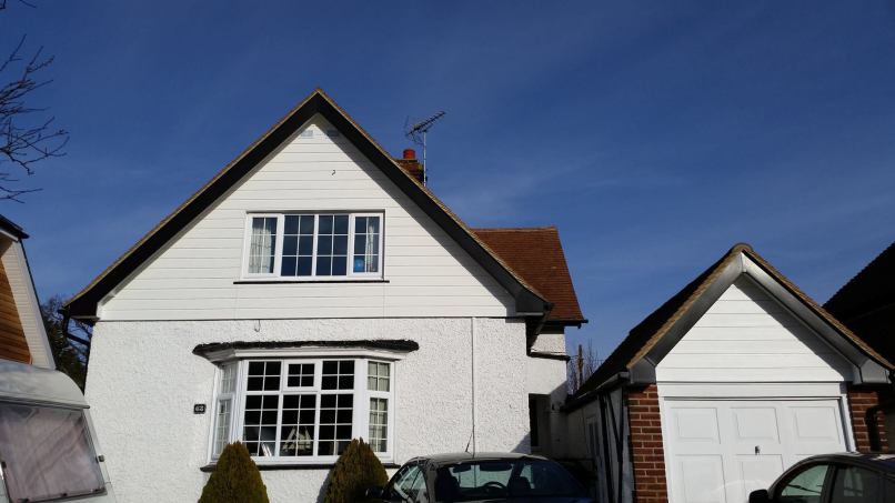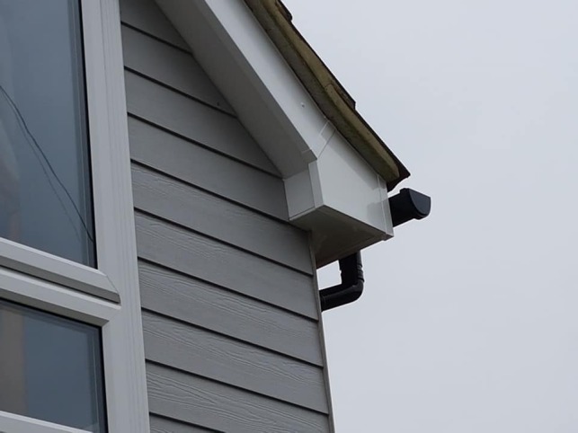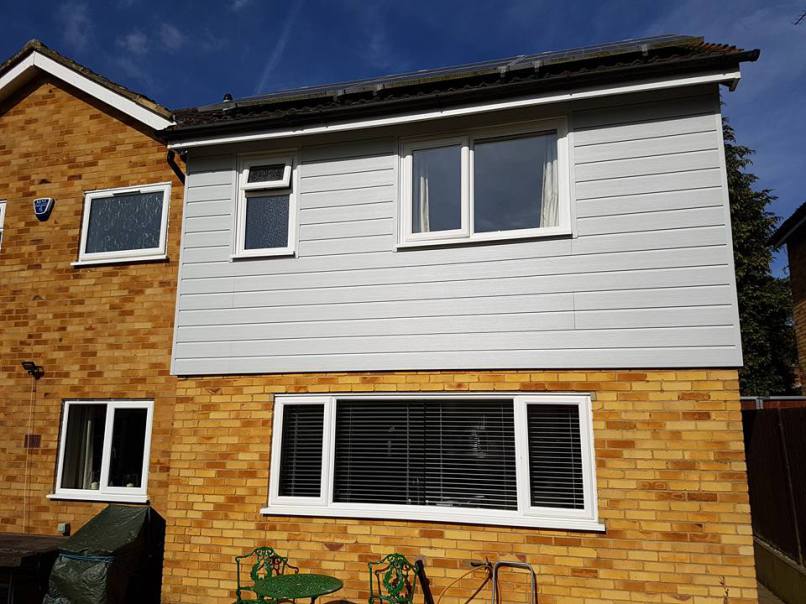 Light grey Hardie Plank installation below with white UPVC fascias and soffits